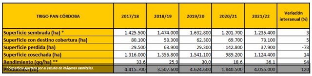 La superficie sembrada de trigo pan en la provincia de Córdoba fue de 1.235.400 ha, área que representa un aumento del 3 % respecto a la campaña pasada y de las cuales 24.500 se sembraron bajo riego.