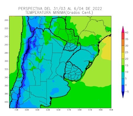 El este del NOA, la mayor parte la Región del Chaco, gran parte de la Mesopotamia, el este y el centro de Cuyo, la mayor parte de la Región Pampeana, el Uruguay y el sudeste y el noroeste del Paraguay observarán temperaturas mínimas superiores a 5°C, con varios focos de registros superiores a 10°C y otros con valores inferiores.