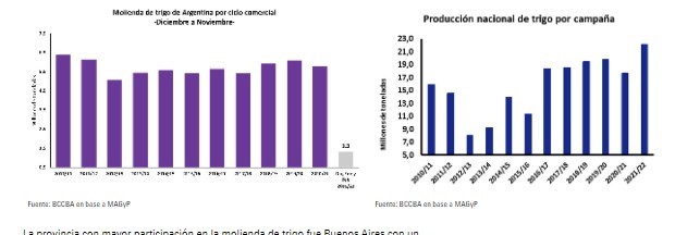 La campaña 2020/21 de molienda de trigo, que finalizó en noviembre de 2021, mostró una disminución del -5% con respecto a la anterior, lo que significó 285 mil toneladas menos. Esto se debió, en parte, a una disminución del 11% de la producción nacional del cereal, la cual pasó de 19,8 a 17,6 millones de toneladas de trigo.