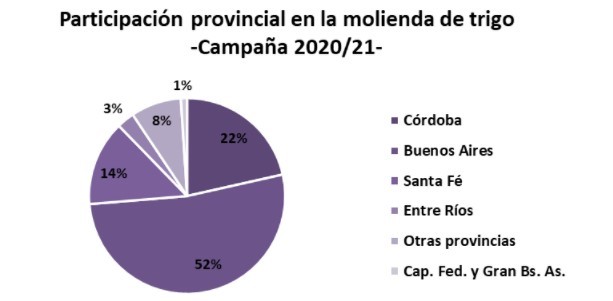 La provincia con mayor participación en la molienda de trigo fue Buenos Aires con un 52%, que se traduce en 3 millones de toneladas procesadas. Le sigue Córdoba con 22%, equivalente a 1,2 millones de toneladas, y Santa Fe con el 14% (812 mil toneladas). El resto de las provincias totalizan 704 mil toneladas molidas de trigo (12%).