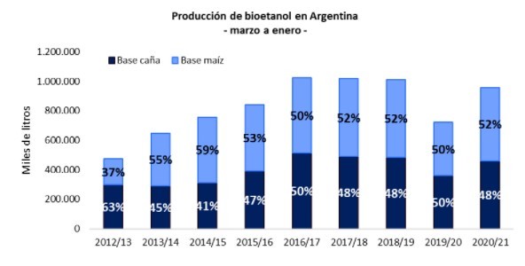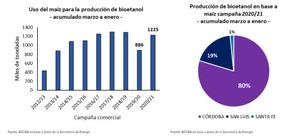 Dentro de los productos que se pueden elaborar a partir del maíz, y que tiene gran relevancia debido a que es un combustible sustituto de los tradicionales, es el bioetanol. En Argentina se produjeron desde marzo a enero de la campaña comercial del maíz 2020/21 un total de 959 millones de litros, donde para el 52% se utilizó como insumo el maíz, y el 48% restante se elaboró con caña de azúcar.