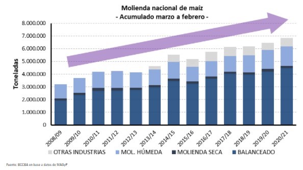 En febrero de 2022 finalizó el ciclo comercial 2020/21 del maíz, donde el volumen industrializado fue el más alto de la historia, reafirmando la tendencia creciente de la molienda nacional del cereal. Durante la campaña comercial 2020/21 se industrializaron 6,85 millones de toneladas, 6% por encima de la campaña anterior y 15% respecto al promedio de las últimas 5 campañas. El 65% del maíz industrial se destinó a la producción de alimento balanceado, el 22% a la molienda húmeda, 3% a molienda seca y 10% a otras industrias. Esta participación se mantuvo relativamente fija en los últimos 5 años.