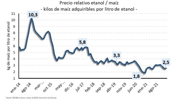 Uno de los incentivos en la producción de bioetanol es el precio relativo respecto a sus costos. Si lo analizamos respecto al precio del maíz, se ha recuperado luego de tocar un mínimo en diciembre de 2020 de 1,8 kilos de maíz adquiribles por litro de etanol. A partir de esta fecha, el precio del etanol que establece la Secretaría de Energía presentó un crecimiento de 119% a febrero del 2022. Así, la relación mencionada se ubica en 2,6 kg de maíz por litro de etanol. Esta mejora de los incentivos puede explicar en parte el mayor uso del maíz para la producción de bioetanol, que además se veía golpeada por la caída en la demanda de combustibles por la pandemia.