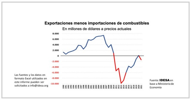 Estos datos muestran que la Argentina tiene condiciones para ser un país exportador neto de combustibles. Cuando aplicó políticas mínimamente racionales logró producir combustibles por encima de lo que consume. En el período 1991 – 2001 había contratos de largo plazo con empresas extractivas que generaron el superávit. En el 2002 se rompen estos contratos y, a pesar de ello, el superávit siguió creciendo hasta el 2006, momento en que empieza a declinar hasta llegar al 2013 con un severo déficit de combustibles. Entre 2015 y 2019 se trataron de recrear las condiciones para las inversiones y recuperar el superávit, pero se revirtieron con el actual gobierno volviendo al déficit energético.