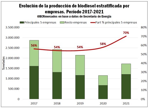 En el siguiente gráfico, se puede observar la participación en la producción de las principales cinco empresas respecto al total y se vislumbra una tendencia al alza desde 2020 y alcanzando nada menos que el 70% en el año 2021. Es importante destacar que las empresas que abastecen las ventas al corte en el mercado local tienen prohibido por ley, abastecer el mercado externo, al tiempo que las vinculadas a la exportación no tienen cupos asignados para vender al corte en el mercado local. En este sentido, la baja en el corte de gasoil está afectando la demanda interna y las posibilidades de producción de las empresas enfocadas en el mercado doméstico que no pueden dirigirse a la exportación.