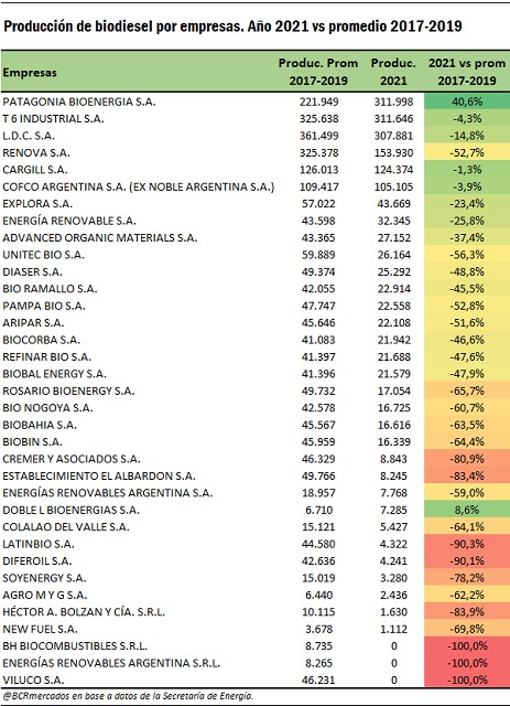 En este sentido, en el siguiente cuadro se puede observar la situación productiva por empresas. Del total de 32 empresas que produjeron biodiesel en 2021, salvo Patagonia Bioenergía el resto de las empresas registró un volumen producido por debajo del promedio alcanzado entre 2017-2019. A su vez, se logra destacar que las fábricas de menor tamaño que producen menos de 50.000 toneladas anuales fueron muy perjudicadas, registrando caídas en la producción superiores al 40% en la mayoría de los casos. En este sentido, los recientes cambios regulatorios que modificaron el corte obligatorio en biodiesel obligaron a recortar fuertemente la producción, sumado a que en 2020 los precios fijados internamente perjudicaron los márgenes de rentabilidad y las posibilidades de producción con dichos valores.