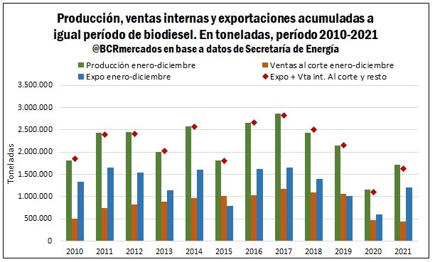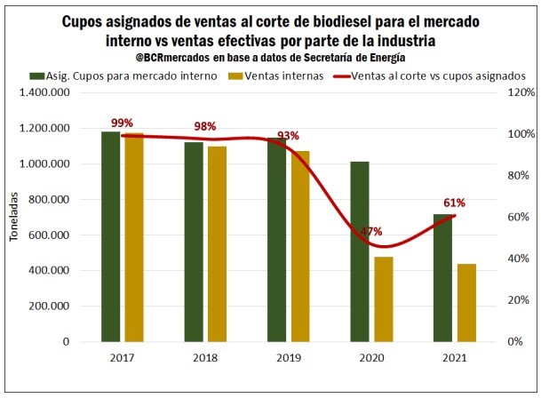 Al tiempo que en 2021, se recortaron los cupos asignados para ventas al corte ante la baja de los mandatos obligatorios de biodiesel en combustibles. A su vez, si se observan las ventas efectivas se mantuvieron muy estables y no se pudo cubrir dicho cupo por partes de las compañías, las cuales registran menos volúmenes de producción respecto a los últimos años.