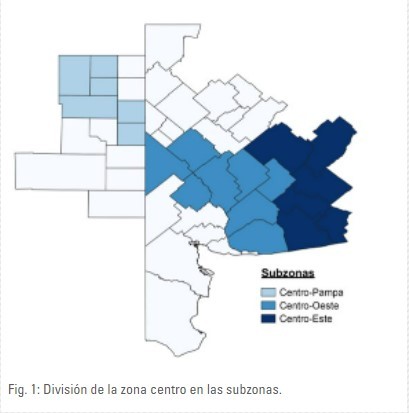 ZONA CENTRO: Registra una media de 1.900 kg/ha (-10%). A continuación, se divide en tres subzonas para un mejor análisis (Fig. 1). Como generalidad, es la zona donde se vio mayor variación en el rendimiento respecto a la fecha de siembra (tempranos vs. tardíos).