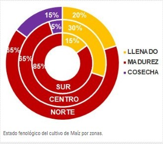Estado fenológico del cultivo de Maíz por zonas. El 25% se encuentra terminando el llenado de grano. El 65% está en diferente grado de madurez. El 10% comenzó la la trilla, siendo estos lotes de siembra temprana principalmente.