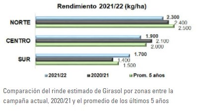 Centro-oeste: El girasol cierra el año con 1.700 kg/ha (mín: 1.400 kg/ha – máx: 2.000 kg/ha), los mejores rendimientos se registraron en el partido de Cnel. Suarez (2.000 kg/ha) y Laprida (1.900 kg/ha).