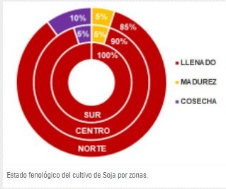 El 5% se encuentra finalizando el llenado de grano. El 85% de los lotes esta en madurez. El 10% restante ha sido cosechado, principalmente en la zona norte.