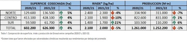 Centro-este: Restando trillar el 15% de la superficie, esta subzona cierra la campaña con un promedio de 2.000 kg/ha (mín: 1.600 kg/ha – máx: 2.300 kg/ha). Se observaron lotes puntuales con alta incidencia de Phomopsis y quemado de capítulos por las altas temperaturas de la primera quincena de enero.