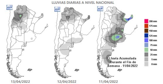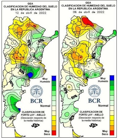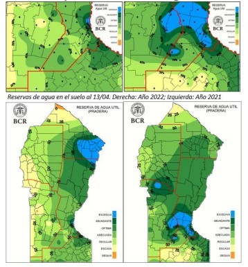 Si bien las recientes lluvias de abril se concentraron sobre el sudeste cordobés y una franja del sur de Santa Fe y dejaron en algunas localidades más de 50 mm, en la cuarta parte de la región las reservas de agua del suelo aún están entre regulares y escasas. En el resto de la región se observan reservas adecuadas que aumentan hacia el este, con un sector con excesos de agua al norte de Rosario. El año pasado la situación para el trigo era mucho más favorable: una tormenta (entre el 8 al 12 de abril) dejaba casi 100 mm de promedio en la región, y Montes de Oca, Clason y Marcos Juárez, superaron los 200 mm (con los problemas que eso causó en la cosecha). Esas lluvias dejaron excesos de agua en el centro sur de Santa Fe y este de Córdoba, pero no lograron recuperar las reservas en el noroeste de Buenos Aires que continuaron con reservas escasas, aun hasta fines de abril del 2021. Este año, las lluvias que vienen acompañando al norte bonaerense, mantienen las adecuadas condiciones hídricas en esa zona. En los próximos 15 días se necesitaría 20 a 40 mm más para lograr condiciones óptimas de humedad en el este de Córdoba, requerimiento que aumenta considerablemente hacia el oeste. Cada milímetro que sume abril será fundamental para establecer el área triguera 2022/23