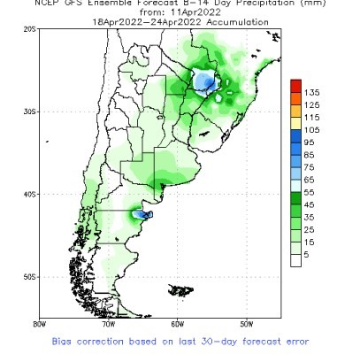 No, el ingresó de una masa de aire frío y seco asegura el buen tiempo en todo el país y en particular en la región. Aiello explica: “los modelos de pronóstico indican la continuidad del tiempo estable y libre de precipitaciones durante los próximos siete días y posteriormente el ingreso de un frente frío que podría generar nuevas lluvias de cara a la última semana del mes”. Y así lo muestra la salida hasta el 24 de abril de la NOAA
