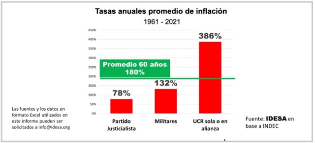 - En los años de la Unión Cívica Radical, sola o en alianza, la tasa de inflación promedio fue de 386% anual.