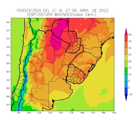 • El centro-este y el este del NOA, el Paraguay, el norte de la Región Pampeana, la mayor parte de la Mesopotamia y el norte del Uruguay observarán temperaturas máximas superiores a 30°C, con focos cercanos a los 40°C sobre el norte de La Argentina y el Paraguay.