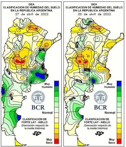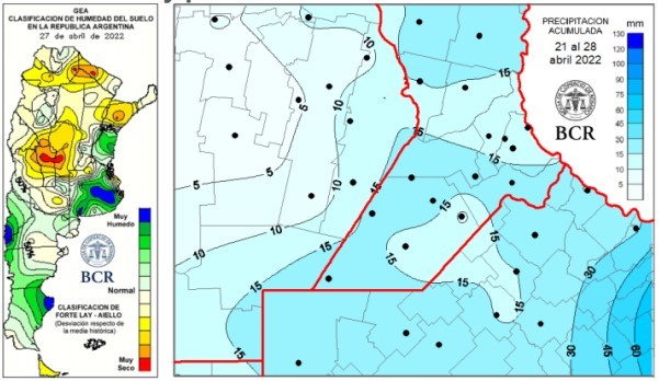 Solo en SE bonaerense hubo registros que pasaron los 40 mm. “La situación no es alentadora para la franja oeste mediterránea”, dice Aiello. “El comportamiento pluvial del mes de abril no ha provocado mejoras significativas en ese sector y, con el avance del otoño, estamos ingresando al periodo en el cual es cada vez más difícil que se registren lluvias abundantes sobre el oeste del país”. “El ingreso del último sistema frontal, cargado de aire más frío y seco, establece condiciones de estabilidad que, según muestran los pronósticos de corto plazo, difícilmente cambien hasta el final de abril. Si esta tendencia se mantiene en la transición hacia el mes de mayo las posibilidades de revertir la escasez de reservas, en las áreas más complicadas del oeste, se vuelven cada día menos probables”.
