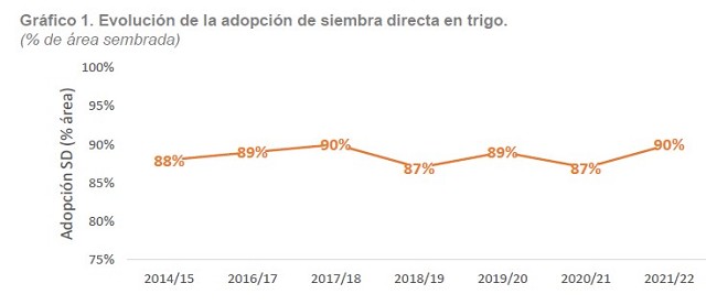 En la campaña 2021/22 el 90% del área se realizó bajo siembra directa, 3 p.p. por encima de la campaña anterior. La evolución de la adopción de siembra directa de trigo a nivel país se representa en el gráfico 1.
