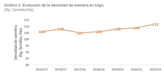 En el grafico 2 se muestra la evolución de la densidad de siembra. La densidad de siembra promedio para trigo a nivel nacional fue de 112 Kg. Semillas/Ha en la campaña 2021/22.