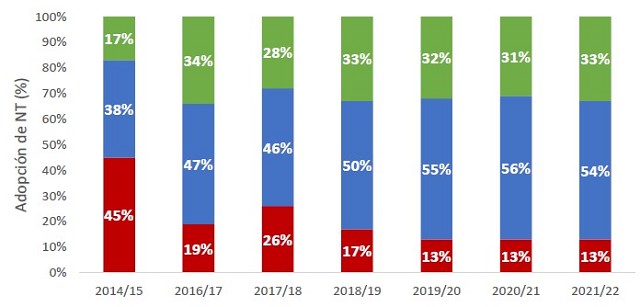 Como resultado de la conjunción del uso de insumos y las prácticas de manejo empleadas en trigo durante la campaña 2021/22, la adopción de niveles tecnológicos se distribuyó en 33% de nivel alto, 54% medio y 13% bajo.