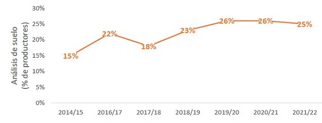 En relación a la fertilización para determinar cuánto, cuándo y cómo se deben aplicar los nutrientes necesarios para el óptimo desarrollo de trigo, es necesario evaluar las condiciones de fertilidad del lote. Para eso, el análisis de suelo es una de las herramientas de diagnóstico más difundida, debido a que permite conocer la disponibilidad de nutrientes antes de la siembra. En la campaña 2021/22 el 25% de los productores realizó análisis de suelo en trigo, valor que se mantiene prácticamente sin variaciones a lo largo de las últimas campañas. La evolución del mismo puede verse en el gráfico 4.
