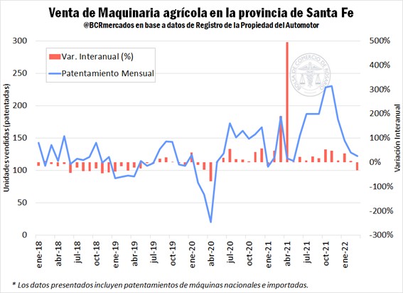 Acorde con esto, los datos de ventas de maquinaria agrícola en la provincia (que también incluyen maquinaria importada) exhiben un incremento interanual en las unidades vendidas en prácticamente todos los meses del último año (la única excepción fue el mes de enero 2021), que se extendió incluso hasta comienzos del año que corre. Asimismo, en términos absolutos, en noviembre del año último se alcanzó un total de 230 patentamientos de maquinaria, lo que representa un máximo desde al menos enero de 2016. No obstante, esta tendencia se cortó en el mes de marzo, cuando se registró la primera caída interanual en las ventas de maquinaria en 15 meses.