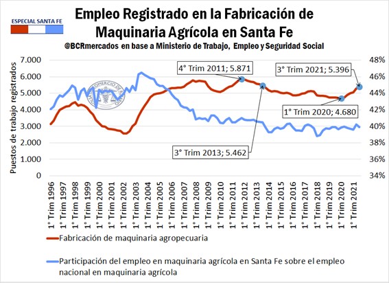Por otra parte, también resulta interesante marcar que, según los datos del ministerio, la fabricación de maquinaria agrícola tenía empleadas un total de 13.516 personas en el 3er trimestre del último año, por lo que Santa Fe representa el 40% del empleo total en el rubro, lo cual condice con el número de empresas que se encuentran localizadas en la provincia (el mencionado 44% del total).