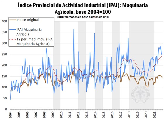 Además, cuando comparamos la evolución del sector con el Nivel General del índice (línea marrón del gráfico), se observa que el rubro Maquinaria Agrícola tuvo un desempeño superior al resto de las actividades productivas. De hecho, la variación interanual acumulada del índice general arroja un crecimiento del 18% en el último año en la provincia, mientras que el sector de maquinaria para el agro en particular indica un acumulado interanual del 25%.