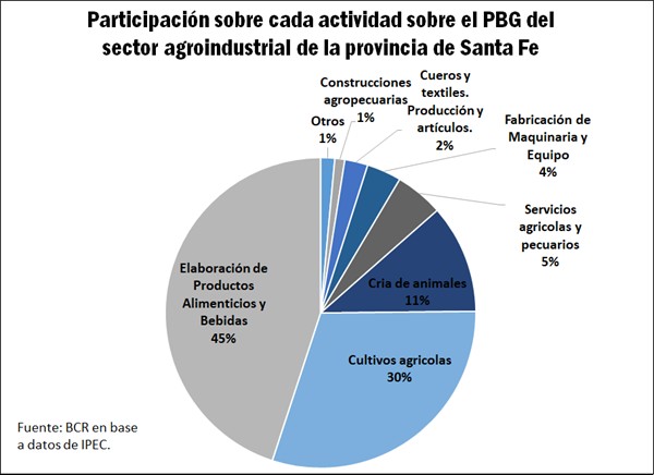 La Industria Agroalimentaria per se, exceptuando la originación de sus materias primas, concentró en el año de referencia el 54% del PBG del sector manufacturero. Si a eso le sumamos los demás sectores relacionados con las Agroindustrias (industrias del algodón, maquinarias agrícolas, industria del tabaco, madera, entre otras), se explica el 69% del sector productor de manufacturas de Santa Fe. Es decir, $2 de cada $3 pesos en valor agregado que genera la industria santafesina corresponden a manufacturas de origen agropecuario.