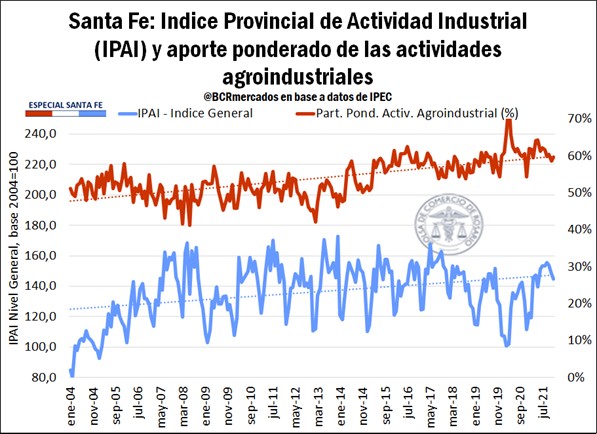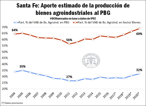 En total, el Sector Agroindustrial, concentró en 2020 el 32% del Producto Bruto que generó de Santa Fe; es decir, $3 de cada $10 pesos de Valor Agregado que generó la provincia correspondieron a la actividad de las cadenas agroindustriales. Si nos focalizamos solamente en el sector productor de bienes, y excluimos a los servicios de esta consideración, vemos que el sector representó en 2020 el 69% del Valor Bruto de Producción de este, el valor más alto alcanzado en la serie analizada. Esto indica que el sector es de suma importancia para Santa Fe si comparamos con otras economías regionales como por ejemplo la Minera y Petróleo en Neuquén (39 % sobre el PBG) o en San Juan (10,4 % sobre el total del PBG).
