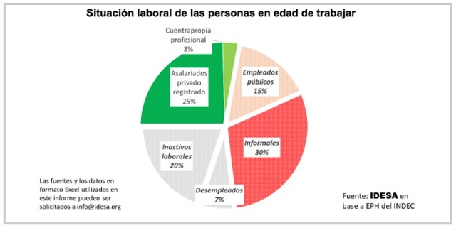 Una faceta particularmente sugerente aparece cuando se analiza la situación de la gente en edad de trabajar. En Argentina hay aproximadamente 23 millones de personas urbanas en edad de trabajar, esto es, entre 20 años y la edad jubilatoria. Según el INDEC, la situación laboral de estas personas se puede clasificar como sigue: