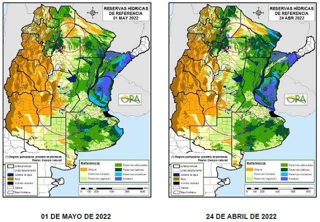 Los mapas corresponden a la estimación de contenido de agua en el primer metro de suelo para PASTURA implantada o natural, dependiendo de la zona. Valores de reservas para localidades específicas se pueden consultar en http://www.ora.gob.ar/camp_actual_reservas.php.