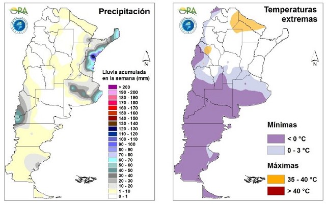 Las mínimas de la semana fueron bajas, con heladas en Patagonia, sur de Mendoza y San Luis, La Pampa y sur de Buenos Aires, además de áreas cordilleranas. La temperatura más baja se registró en Maquinchao (-11.2°C). En las provincias pampeanas las mínimas más bajas se registraron en el sudoeste bonaerense, con un mínimo reportado de -4°C en Coronel Suárez.