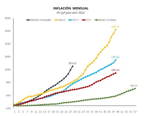 Con este dato, en los primeros cuatro meses de 2022 los precios al consumidor subieron 23,1%. Esto significa que en el primer cuatrimestre se alcanzó una suba de precios equivalente al 70% de lo que estaba previsto en el Proyecto de Presupuesto 2022 para todo el año (33%) y casi la mitad de la banda superior de la proyección del FMI (48%).Con esta suba, la inflación interanual se ubicó en 58,1% y acumula 11 meses consecutivos con aumentos por encima del 50%. De esta manera, la inflación interanual es mayor al pico de la gestión de Cambiemos de 57,3% anual en mayo del 2019. Además, en los primeros 28 meses de la gestión de Alberto Fernández, la inflación acumulada fue del 153,1%, 60 puntos por encima de la acumulada en mismo período para la gestión de Mauricio Macri (92,8%).