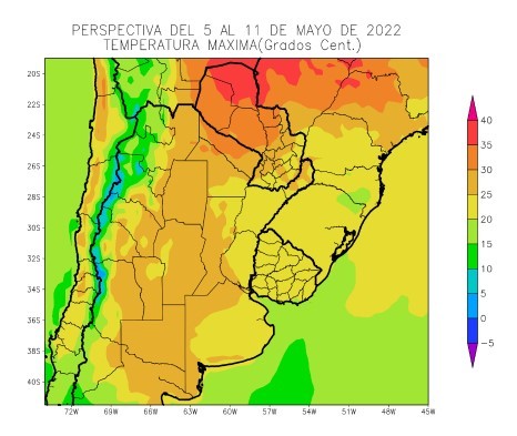 • El sur del área triguera, el oeste del Delta y el sur de la Región Sudeste observarán temperaturas máximas por encima de 35°C, con focos de 40°C que se ubicarán sobre el nordeste y el sur de Texas y otros focos con valores inferiores.
