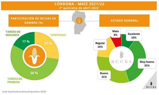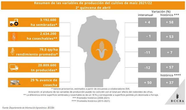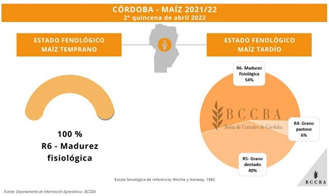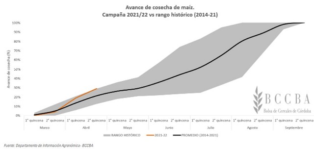 Principios de abril, los maíces tempranos (sembrados antes del 1 de noviembre), que equivalen al 27 % de la superficie total, ya habían culminado su ciclo. En cuanto al área sembrada en fechas tardías, el 46 % de los lotes aún no han alcanzado la madurez fisiológica, encontrándose entre grano pastoso y grano dentado. Hacia fines de abril, la cosecha llegaba al 29 %, marcando el mayor avance en la misma fecha respecto a las últimas 6 campañas.