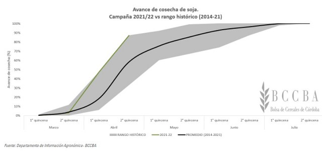 A principios de mayo, el avance en la labor de trilla superaba el 85 % de los lotes de soja, mostrando el mayor avance en la actividad respecto a las campañas anteriores (2014-2021).