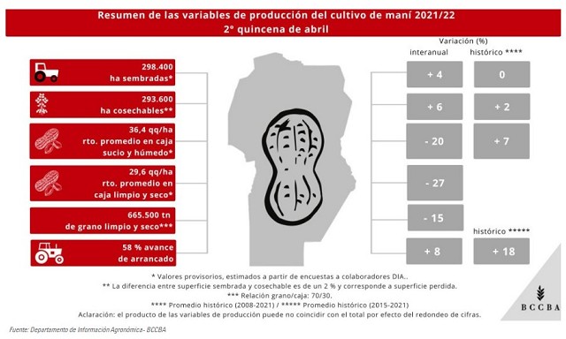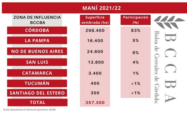 La superficie cultivada con maní en la campaña 2021/22 habría alcanzado casi 300.000 hectáreas en la provincia de Córdoba, lo que representa algo más del 80 % de las hectáreas sembradas en la zona de influencia y análisis de la BCCBA. El área marca un aumento interanual del 4 % en la provincia y del 1 % en toda la zona de influencia de la BCCBA.
