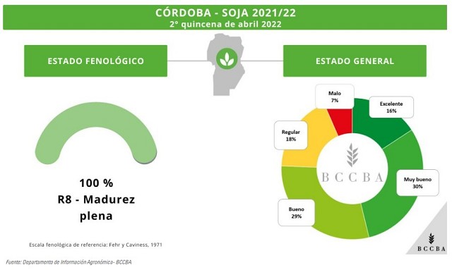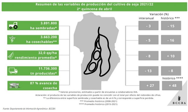 Se estima un área sembrada de casi 3,9 millones de hectáreas de soja en la provincia, de las cuales el 94 % serían cosechables y resultarían en una producción estimada de 11,7 millones de tn. Este tonelaje marcaría una baja respecto a la campaña pasada y al promedio histórico desde la campaña 2008/09, al igual que el rendimiento que, siendo de 32,0 qq/ha, disminuyó un 8 % respecto al ciclo anterior.