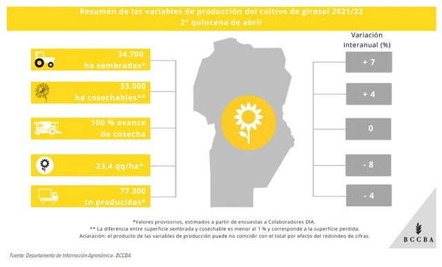 Habiendo finalizado la cosecha de las 33 mil hectáreas de girasol que resultaron cosechables en la provincia, la estimación realizada en el mes de abril indicó un rendimiento promedio provincial de 23,4 qq/ha y una producción de 77.300 toneladas. Estos valores productivos representan una merma interanual del 8 y 4 % respectivamente.