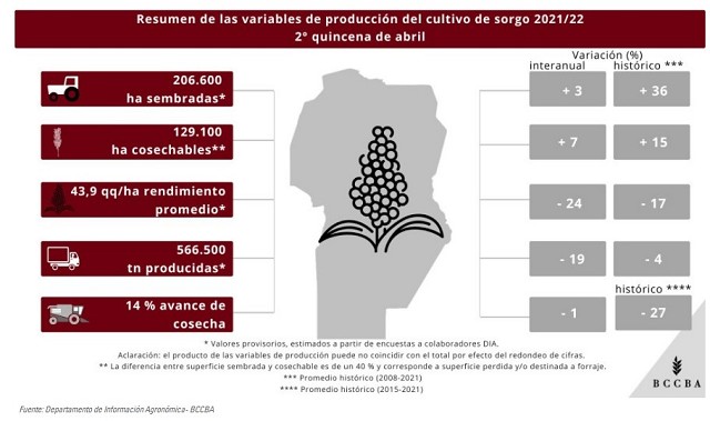 Del área sembrada con sorgo en la provincia un 40 % correspondería a superficie con destino forrajero más superficie perdida, quedando un área cosechable de casi 130 mil hectáreas. A la fecha de relevamiento y según información brindada por nuestra Red de Colaboradores, tanto el rendimiento como la producción de la campaña, con 43,9 qq/ha y 566.500 toneladas, marcarían una baja respecto a campañas anteriores. Con más del 85 % de los lotes en madurez fisiológica (E9), el avance de cosecha a principios de mayo era del 14 %, estando apenas por debajo de los valores alcanzados en campañas anteriores.