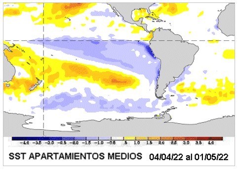 Actualmente el fenómeno sigue presente, pero como una anomalía oceánica, con un muy incierto o nulo acoplamiento atmosférico. Hemos tenido un mes de abril con una fuerte sobreoferta de agua en el norte de la Mesopotamia, Paraguay y el este del NEA, algo que no se condice con una influencia (negativa) del fenómeno La Niña sobre la circulación atmosférica, en partículas sobre la precipitación.