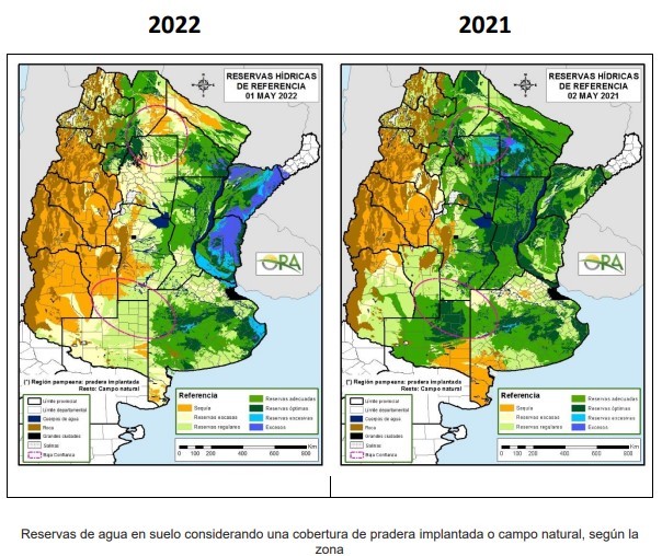 El modelo de Balance Hídrico de la ORA medido a principio de mayo, muestra que el inicio de ambas campañas cuentan con buena disponibilidad hídrica para la siembra. En el 2021 predominaban las reservas adecuadas en la zona central del país, en el noreste de La Pampa y sudeste de Buenos Aires. En tanto que en el 2022 se observan mejores reservas en todo el área centro y sur de Buenos Aires. En esta semana el área con excesos hídricos ya ha desaparecido en la provincia de Entre Ríos y solo permanece una zona con reservas excesivas en el noreste de la provincia.