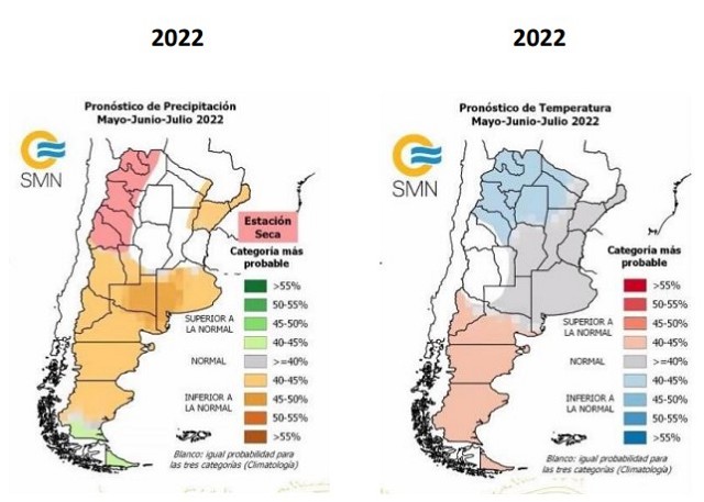 Para esta campaña se prevén lluvias inferiores a lo normal para el trimestre mayo, junio, julio especialmente para la región sudoeste de la provincia de Buenos Aires y noreste de La Pampa. En Córdoba la probabilidad aún no está definida y por el momento se estima la misma probabilidad para las 3 categorías (lluvia normal, superior o inferior). Se estiman temperaturas normales en la mayoría de las provincias de la región pampeana y mesopotámica.