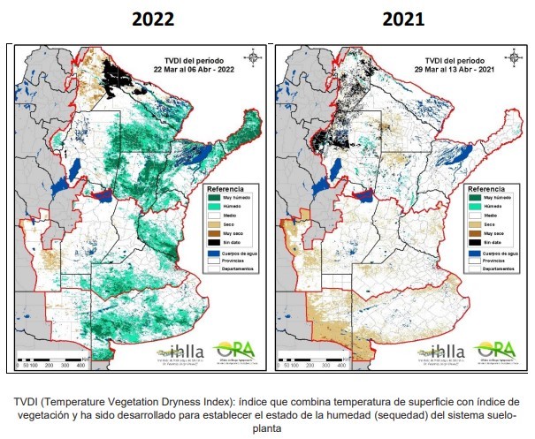 Si comparamos el estado de humedad del sistema suelo – vegetación actual con el del año pasado al mes de abril utilizando el índice TVDI (Temperature Vegetation Dryness Index), vemos que al inicio de la campaña anterior la condición de humedad no sólo era menor, sino que además más despareja, con excesos y faltantes.