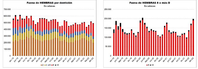 Conformación de la faena: En los primeros tres meses de 2022, la participación de hembras había oscilado en torno del 45%, para trepar al 47% en el mes de abril. El incremento se concentró en vacas y dentro de estas de las más añosas, con 8 o más dientes , una tendencia que fue estimulada por la excepción para las exportaciones de Vaca D y E. El gráfico ilustra claramente el incremento registrado, por el cual, su número fue el más alto desde mayo del año pasado, en que hubo un pico previo a la imposición del sistema de administración de las exportaciones que, con diversos matices, rige desde entonces.