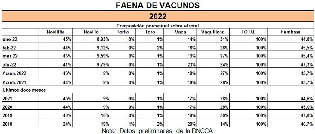 - Producción Abril 2022: 240 mil toneladas. - Promedio similar a marzo 2022. - Alta participación de vacas añosas. - 1er. Cuatrimestre 2022: 4.18 millones de cabezas (-2% respecto a 2021 y el menor desde 2017) - 12 meses a Abril 2022: 12.886 mil vacunos. - Baja de un millón de cabezas respecto a 2020/21.