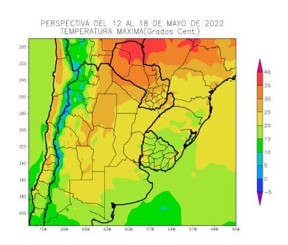 La primera etapa de la perspectiva comenzará con una débil entrada de los vientos del trópico provocando temperaturas máximas superiores al promedio sobre el extremo norte del área agrícola, mientras la mayor parte de su extensión continuará bajo el dominio de los vientos polares.