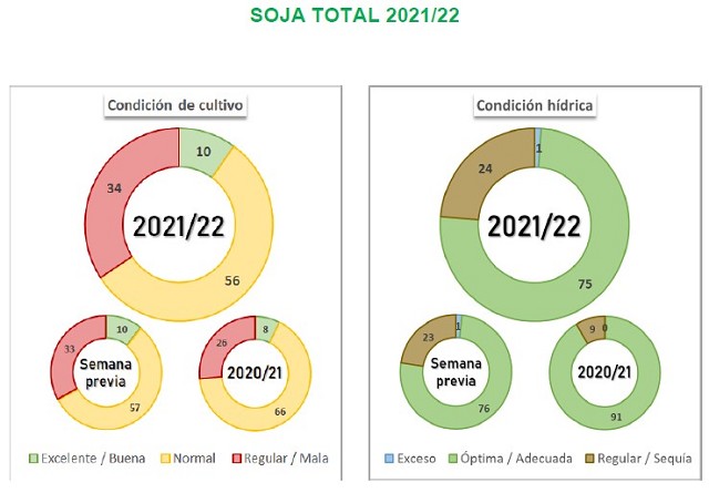 En paralelo, para los cuadros de segunda, el avance de cosecha se eleva al 45,9% del área apta observando un progreso intersemanal de 13,7 p.p. En cuanto el área en pie, el 75,7 % registra una condición hídrica Adecuada/Optima, mientras que el 10,4 % del área remanente reporta una condición de cultivo Buena/Excelente, una desmejora de 2,1 p.p.