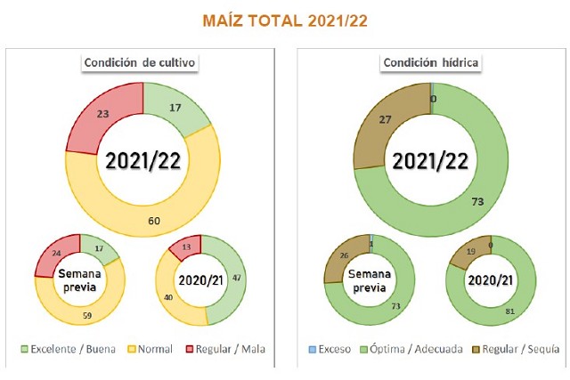 Por último, para maíz, luego de registrar un progreso intersemanal de 1,6 puntos porcentuales, el avance nacional de cosecha se ubica en 27,4 %. Mientras un 56,5 % de los cuadros de maíz temprano ya fueron cosechados, las zonas Centro-Norte de Córdoba, Sur de Córdoba, Núcleo Norte, Núcleo Sur y San Luis comenzaron la trilla de maíz tardío/2da, con un avance del 1,7 % del total nacional. Del área todavía en pie, se estima que un 26,9 % presenta una condición hídrica Regular/Sequía, 0,8 p.p. por encima de lo relevado la semana previa. En paralelo, un 59,1 % del área de maíz tardío y de segunda ocupación presenta una condición de cultivo Normal. En lo que respecta a fenología, tanto el maíz temprano como el maíz tardío y de segunda en pie se encuentra en Madurez Fisiológica en el 92,8 % y 83,9 %, respectivamente.